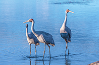 Of the 14 species that comprise a worldwide family of cranes, brolgas (Grus rubicunda) are the only species native to Australia. Also known as the Native Companions, they can be found in grasslands and swamps along the Queensland coast, from Rockhampton to the Gulf of Carpentaria.