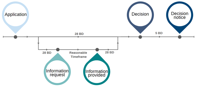 - If the department asks for more information, the applicant will be given a reasonable timeframe to provide this and the decision will be made within 28 days of receiving the information.
