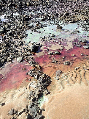 Trichdesmium spp. washed ashore on a beach. Note red, brown and blue colours.