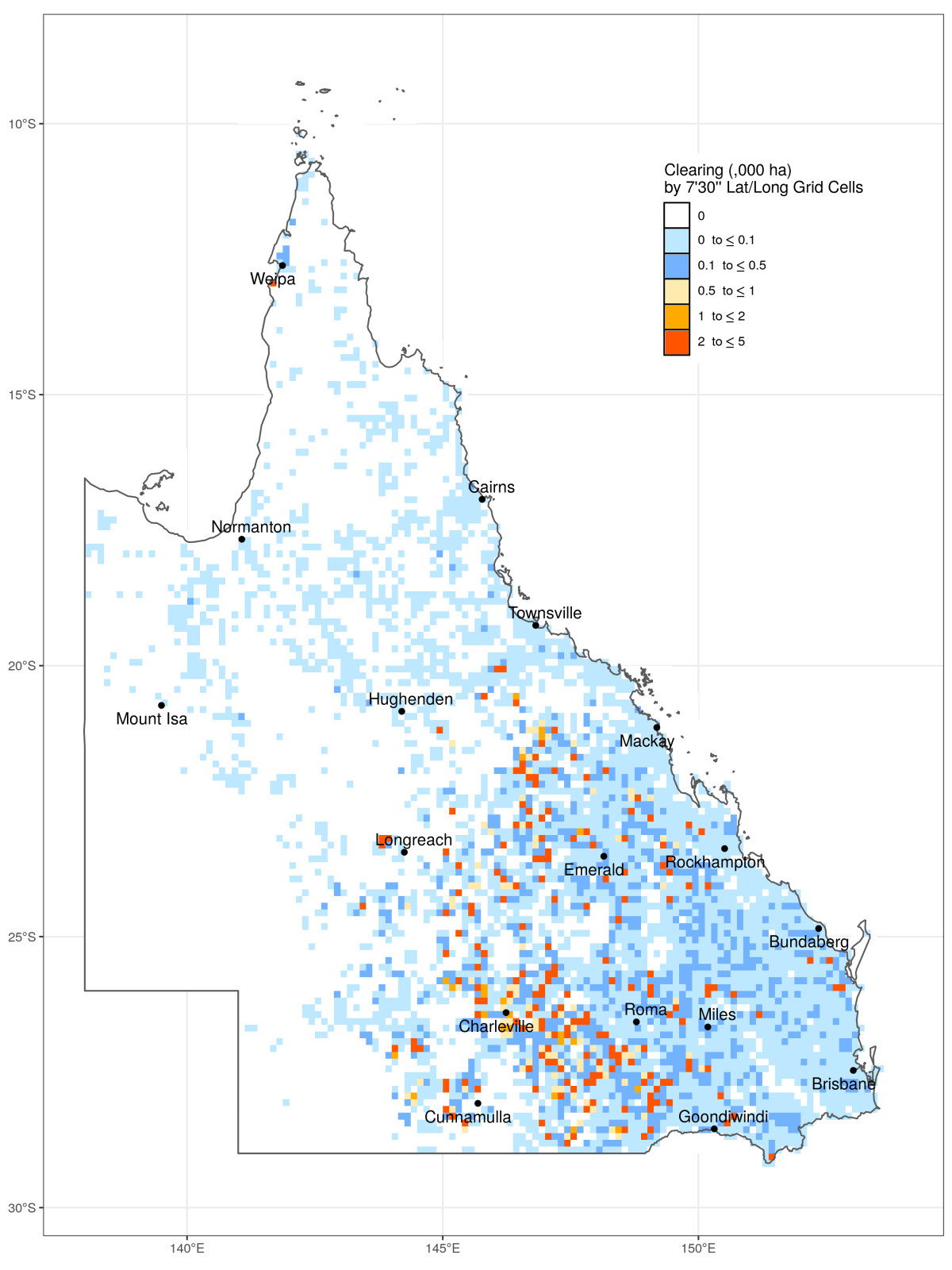 Density of woody vegetation cleared in Queensland in 2018–19