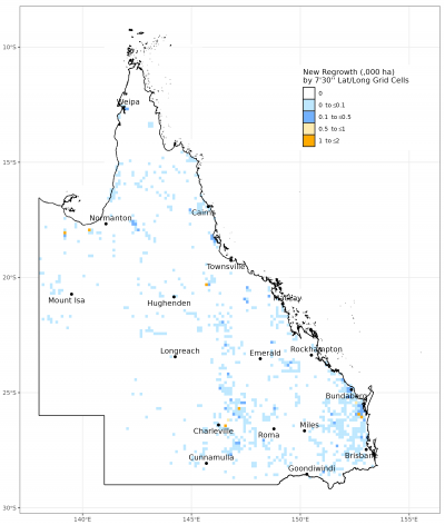 Map of the spatial distribution of all new regrowth mapped in Queensland in 2021–22, summarised by 7’30” latitude/longitude grid cells (each cell is approx. 17,500ha). Orange cells indicate that a greater area of regrowth has occurred at that location.