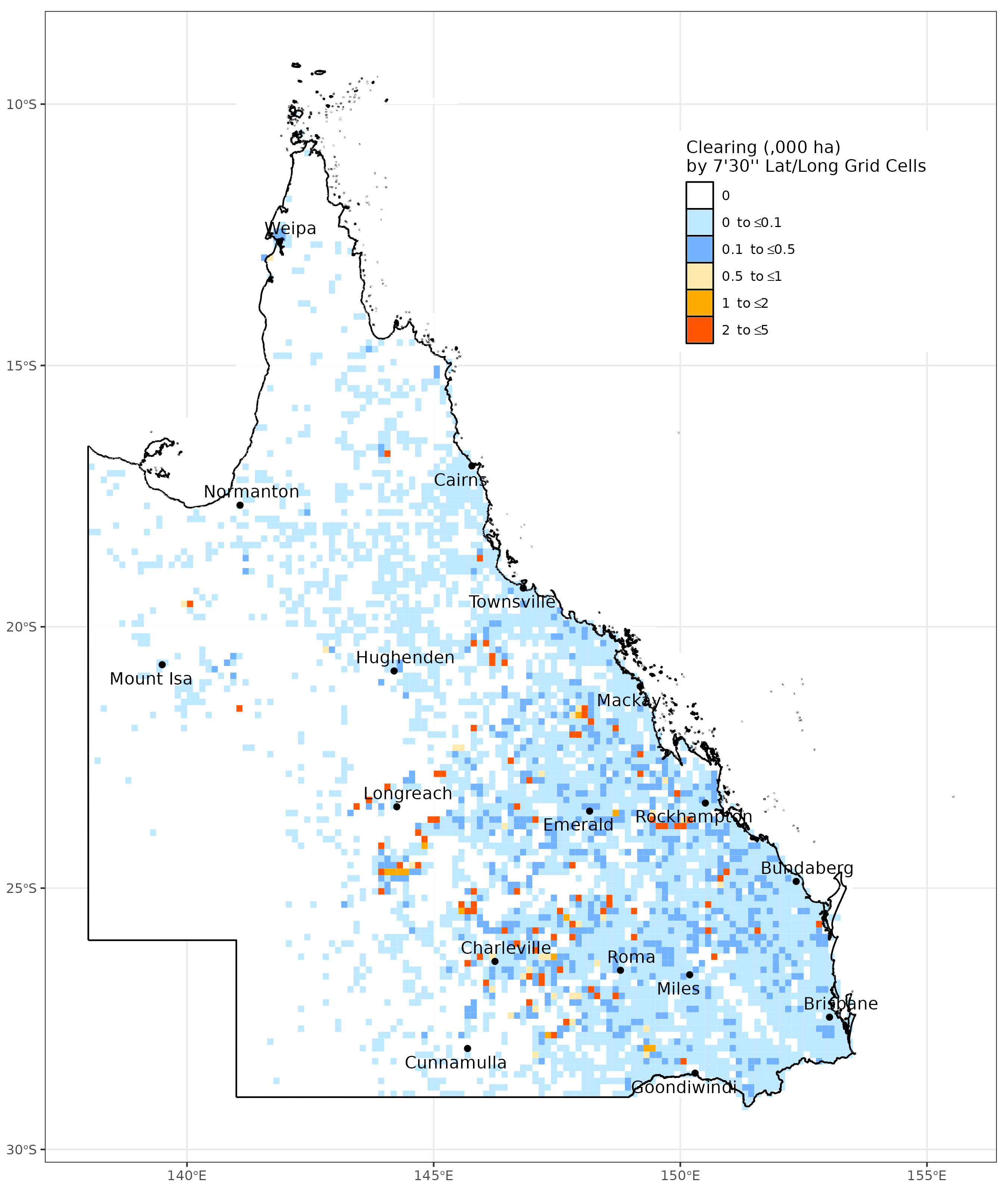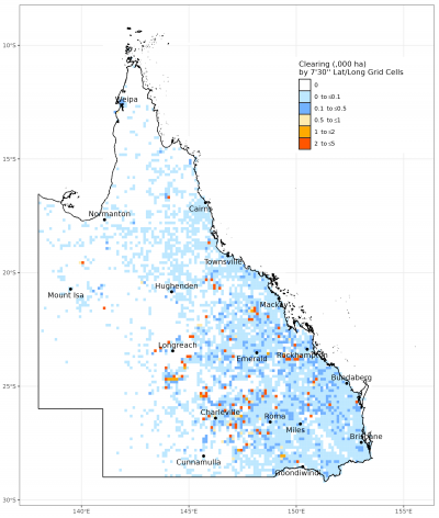 Map of the spatial distribution of all clearing activity mapped in Queensland in 2021–22, summarised by 7’30” latitude/longitude grid cells (each cell is approx. 17,500ha). Red and orange cells indicate that a greater area of clearing activity has occurred at that location.
