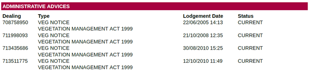 Each 'veg notice' has a dealing number. Every dealing number is a separate item attached to the land by the Department of Natural Resources and Mines, Manufacturing and Regional and Rural Development for a vegetation management-related matter. There are 3 types of administrative advice that you may find: