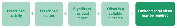 An environmental offset may be required as a condition of approval where—following consideration of avoidance and mitigation measures—a prescribed activity is likely to result in a significant residual impact on a prescribed environmental matter(s). Figure 2 provides an overview of the process used to determine if an environmental offset is required for an activity.