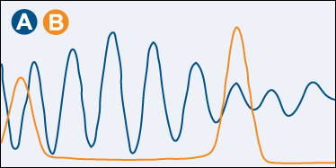 The pollutants of interest already have their spectra stored in a reference library (examples A and B) and the analyser uses varying proportions of these spectra to create a best match with the measured absorption spectrum.