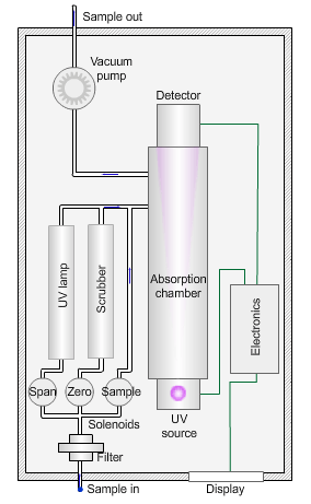 To determine the ozone concentration, a pump draws a sample of ambient air through a filter and into an absorption chamber where UV light of wavelength 254nm from a mercury vapour lamp irradiates the sample.