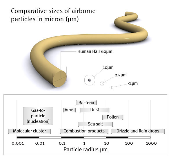 PM10 and PM2.5 particles are invisible to the naked eye. By way of comparison, a human hair is about 60 micrometres in diameter.