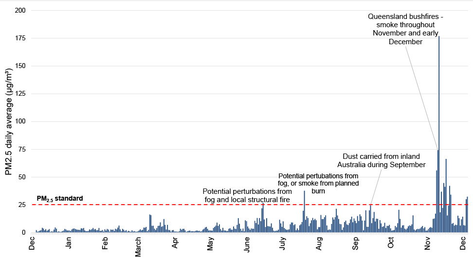 PM2.5 data collected in the project indicated that air quality in the Wynnum area is of good quality and fluctuated with local and regional events and meteorology throughout the year. Average PM2.5 concentrations were consistently below standard throughout the year, although air quality was most significantly impacted by bushfire smoke across Queensland during November and December 2019, where the project identified some exceedances. An exceedance was also identified in June and July 2019, which was likely the result of overestimations of particles in foggy or moist conditions due to the low-cost nature of the devices being used.
