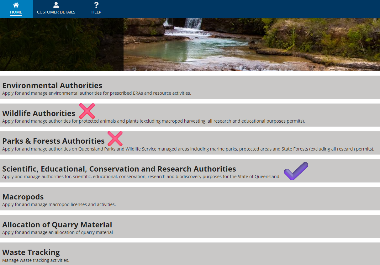 To apply for Scientific, Education, Conservation and Research Authorities conducted on non-protected areas such as freehold land, leasehold land and council reserves or protected areas such as national parks, conservation parks and state forests please apply using your Online Services account. Once logged on, please choose the “Scientific, Educational, Conservation and Research Authorities " hub to make your application.
