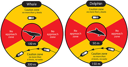 Within a caution zone there are areas designated as ‘no approach’ zones that boats cannot enter. These are the areas closest to an animal and directly in front of and behind an animal. For a whale, the no approach zone surrounds the animal for 100 metres and extends 300 metres in front of and behind the animal. For dolphins, the no approach zone surrounds the animal for 50 metres and extends 150 metres in front of and behind the animal.