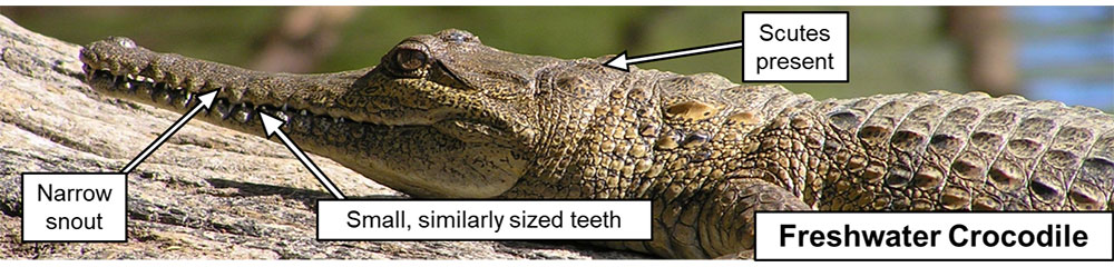 A freshwater crocodile, also called a freshie, is found in freshwater rivers, creeks, wetlands and lakes in-land. It is distinguishable by its long narrow snout, evenly-shaped needle-like teeth and considerable smaller overall build and size. There is also a distinguishing row of four large scales on the neck immediately behind the head.