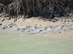 A crocodile slide is a track or mark left behind by a crocodile when they move up, down or through sand or mud banks. It is often associated with a favourite basking spot or shallow water wallow, which can sometimes be hidden from view in mangroves or up a high bank. Slides on a bank are often in a single line as the crocodile has moved up the bank to bask and/or the tide has dropped around it. For large crocodiles, there is sometimes an entry and exit slide mark.