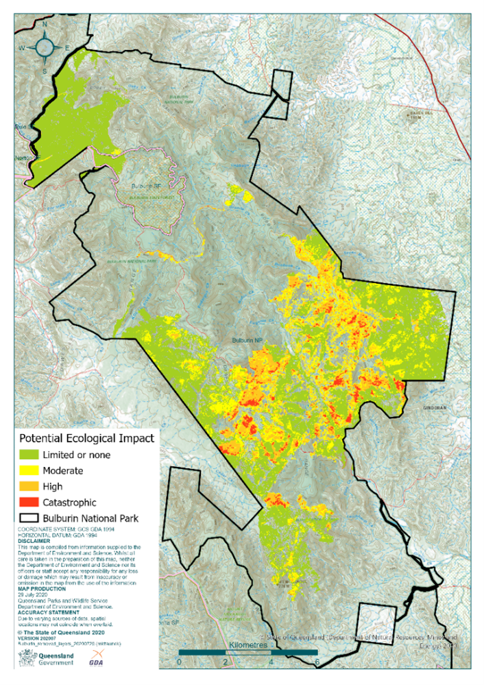 Read the full report Post-fire Assessment Report— Natural Values: 2019/2020 bushfire, Bulburin National Park, South East Queensland Region, August 2020 (PDF, 4.4MB)