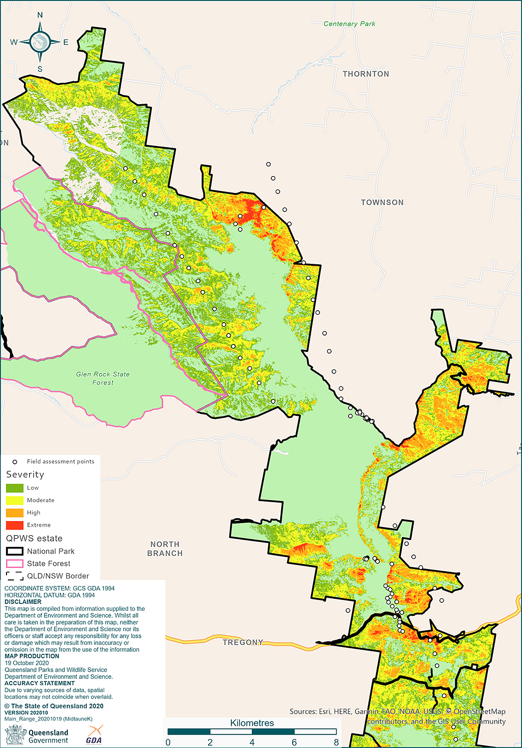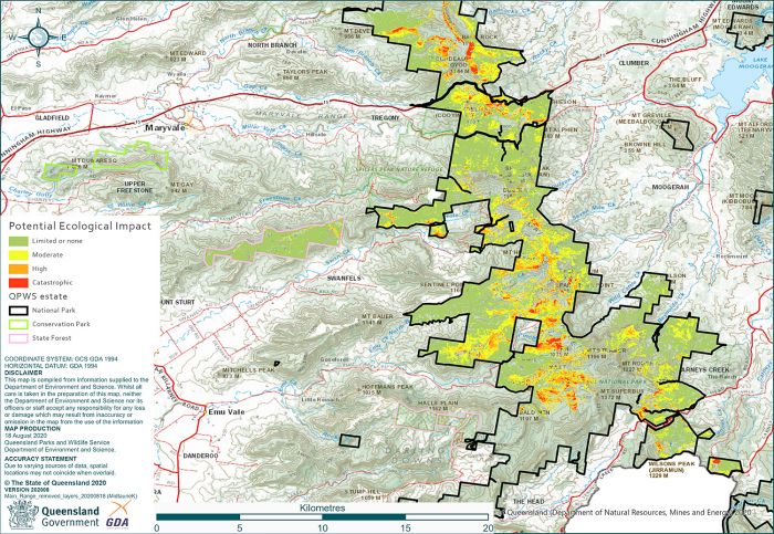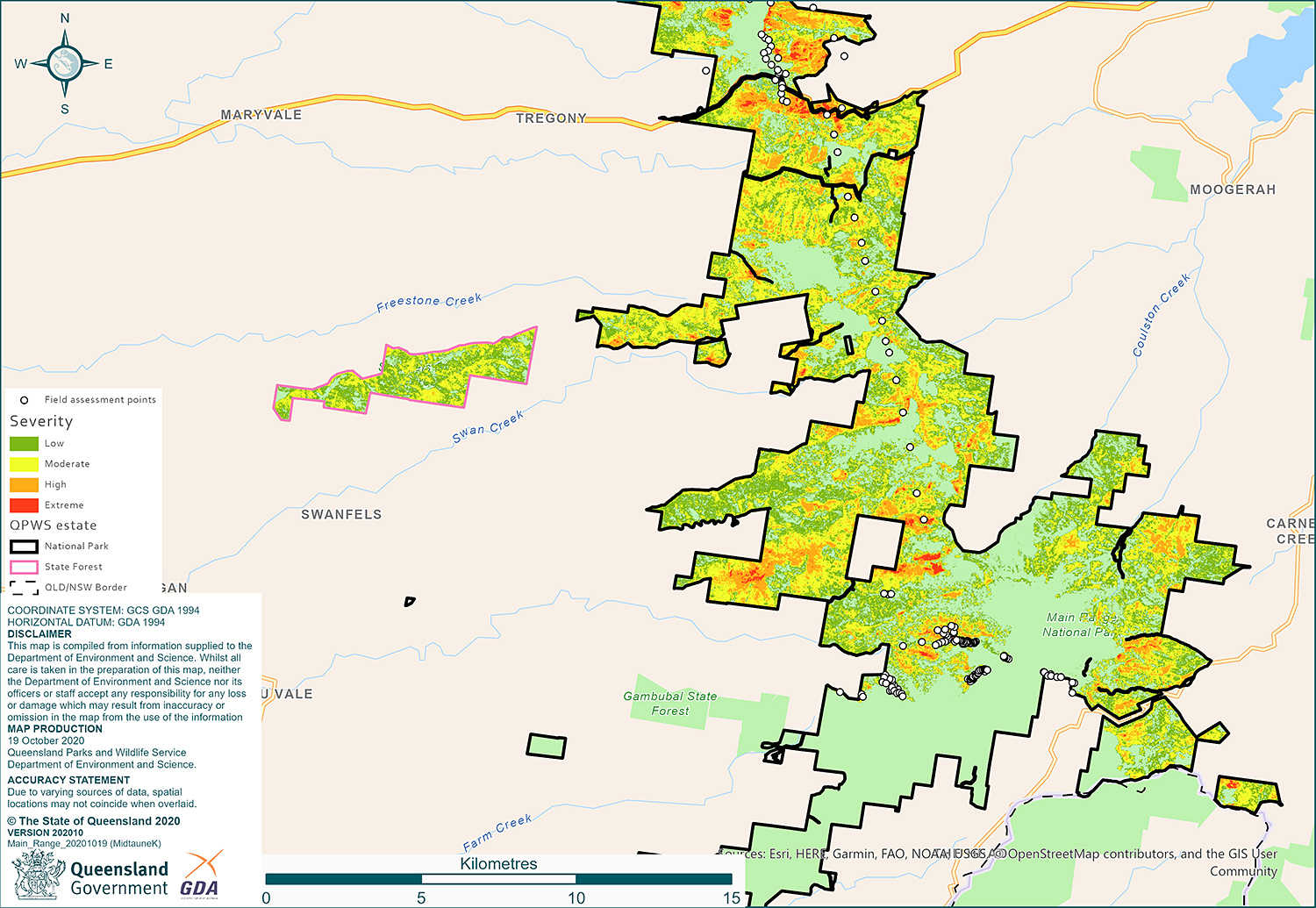 A more detailed assessment of the ecological impacts of the fires was undertaken for each national park in this project. This was initiated with detailed fire severity mapping for the fire-impacted Lamington, Mt Barney and Main Range National Parks.