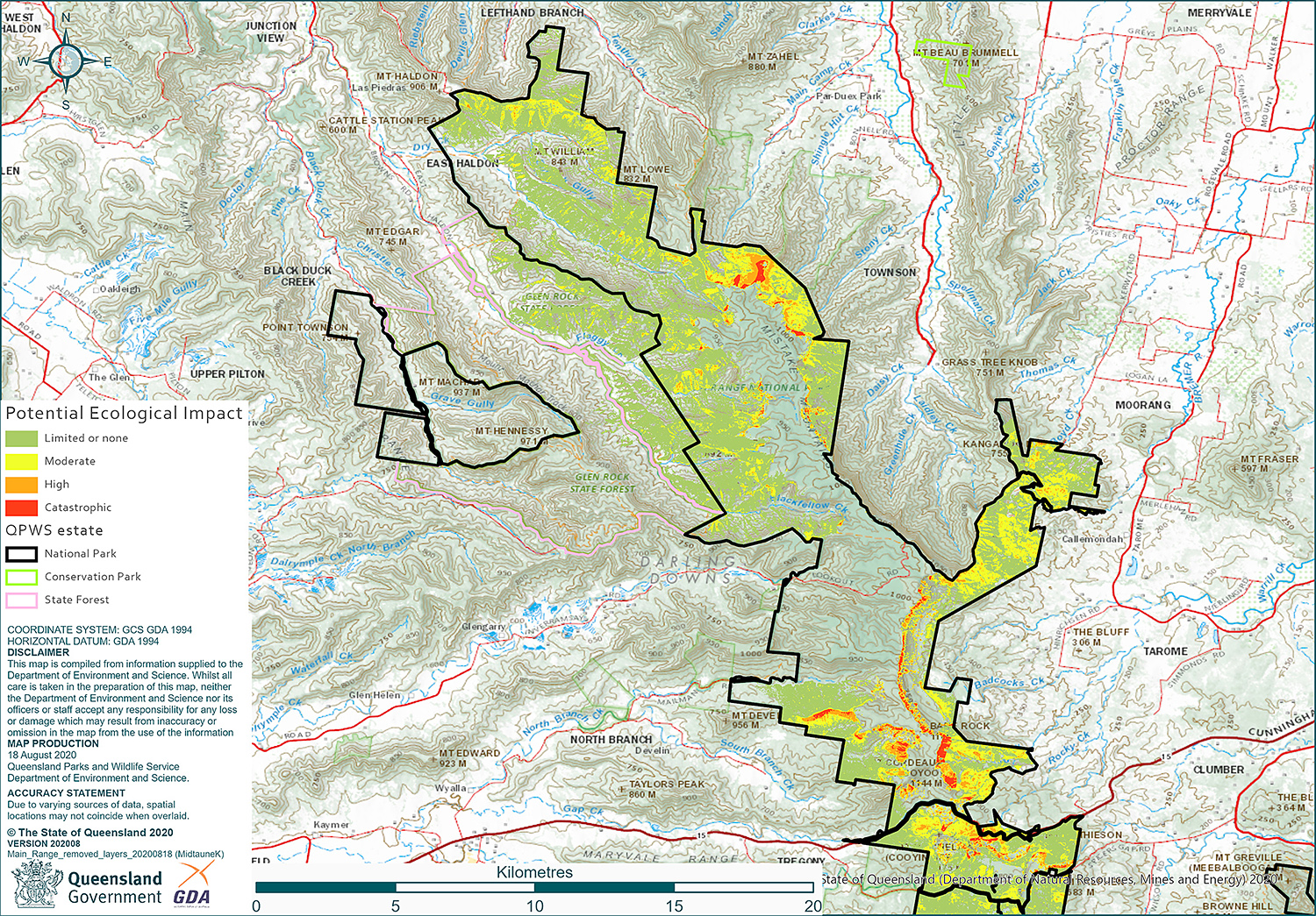 Across Main Range National Park, moderate to high potential ecological impacts were spread across numerous areas.