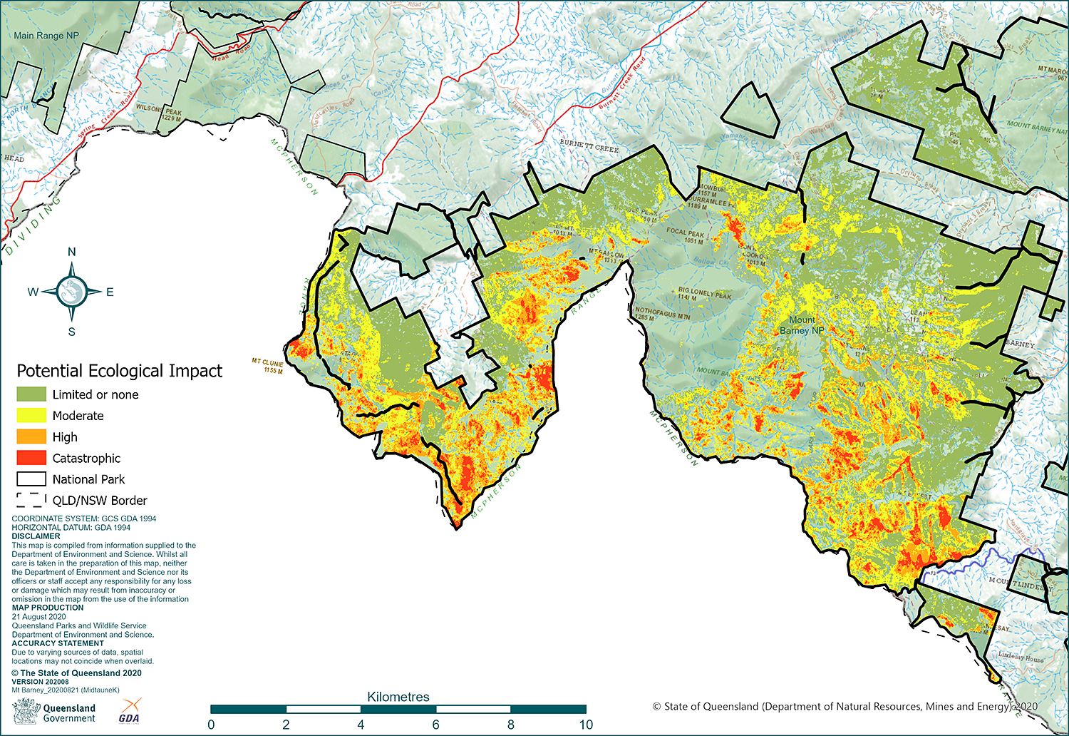 Considering the type of vegetation burnt, and its sensitivity to fire, the map of predicted ecological impacts highlights the areas of greatest ecological concern across Mt Barney National Park.