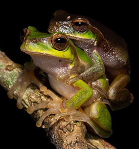 Fleay’s barred frog (Mixopheys fleayi) and Cascade treefrog (Litoria pearsoniana)