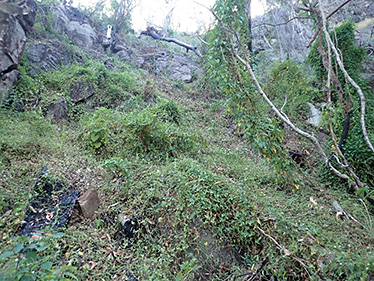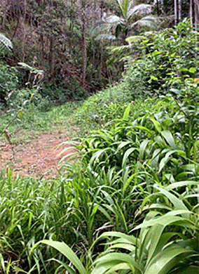 The loss of native vegetation cover from the fires increase the ability of weeds to invade new sites or quickly dominate the habitat, given their capacity to grow and reproduce in a short timeframe and to adapt to a wide range of environmental conditions. In particular, high biomass exotic grasses pose a serious risk to the recovery of burnt plant communities struggling to regenerate by competing with native plants for available water and nutrients. These grasses also create a new fire hazard which can elevate the severity of any subsequent fire, further reducing the capacity of the habitat to recover. Post-fire incursion of other exotic species such as croftonweed, lantana, devil’s fig or tobacco bush also reduce the germination of native seeds or the growth of seedlings by rapidly using critical environmental resources, including sunlight. Aggressive introduced vines such as madiera vine, cat’s claw and moth vine can soon smother canopies and dominate the seed bank. In riparian zones, other species such as the deceptive palm grass can swiftly establish a dense root mass with rhizomes that impede the recovery of native palms and other local species.