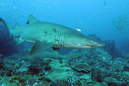 Also known as the spotted ragged-tooth or sand tiger shark, this distinctive fish lives in the shallow coastal waters from the surf zone down to 200m. In South East Queensland, there are 4 aggregation (hang-out) sites and 1 known gestation site at Wolf Rock in the Great Sandy Marine Park. Marine park zones and grey nurse shark designated areas now protect these sites.