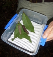 The Richmond birdwing butterfly lays round, yellow eggs singly or in small clusters on one of their two native larval food vines, depending on the location and elevation. The larvae (caterpillars) are dependent on these vines for food. Mature larvae can grow up to 70mm long and are variable in colour, from black to brownish grey. They have a series of prominent, fleshy spines running along their upper body.