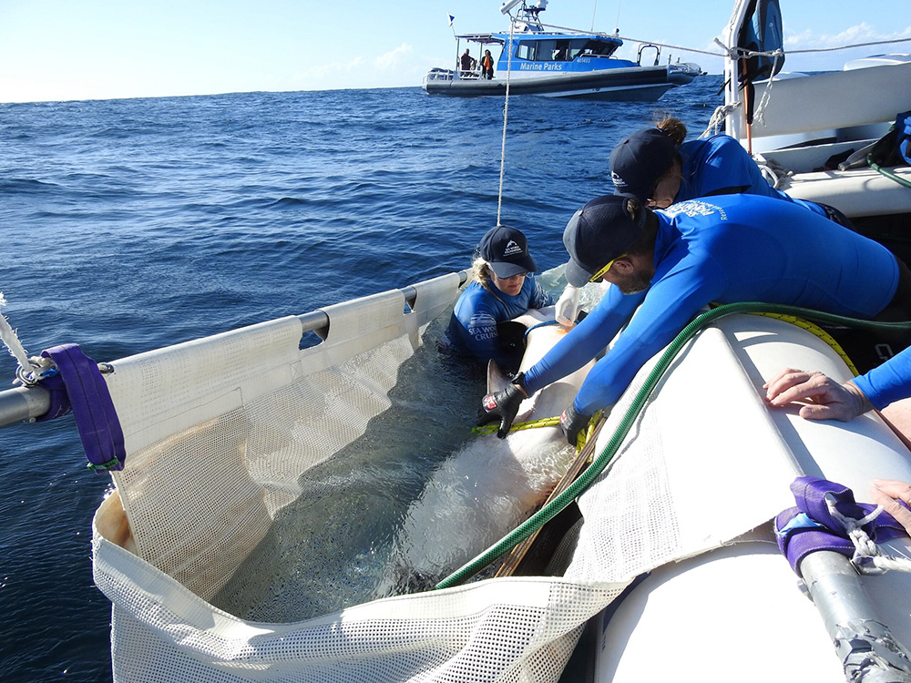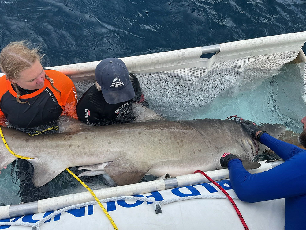 Then, as Senior Conservation Officer Dr Carley Kilpatrick explains, the research team quickly pulls the shark up to the surface and either holds it in the water in a sling secured to the side of a smaller boat or lifts it into a specifically designed shark tank on the deck of a larger vessel.