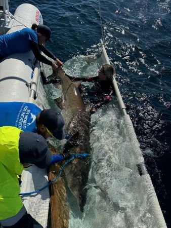 During tagging, a marine biologist monitors the shark’s breathing while a vet tags the shark and takes genetic samples. Within 40 minutes, the shark is released and the team watches it return to its group. Within a day, the team catches, tags and releases 2–4 sharks.