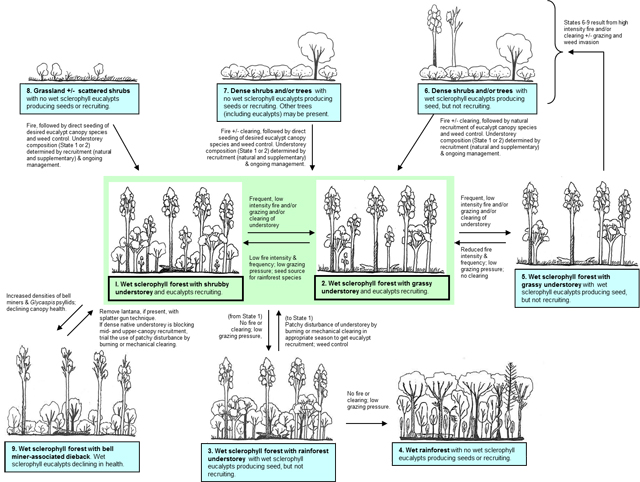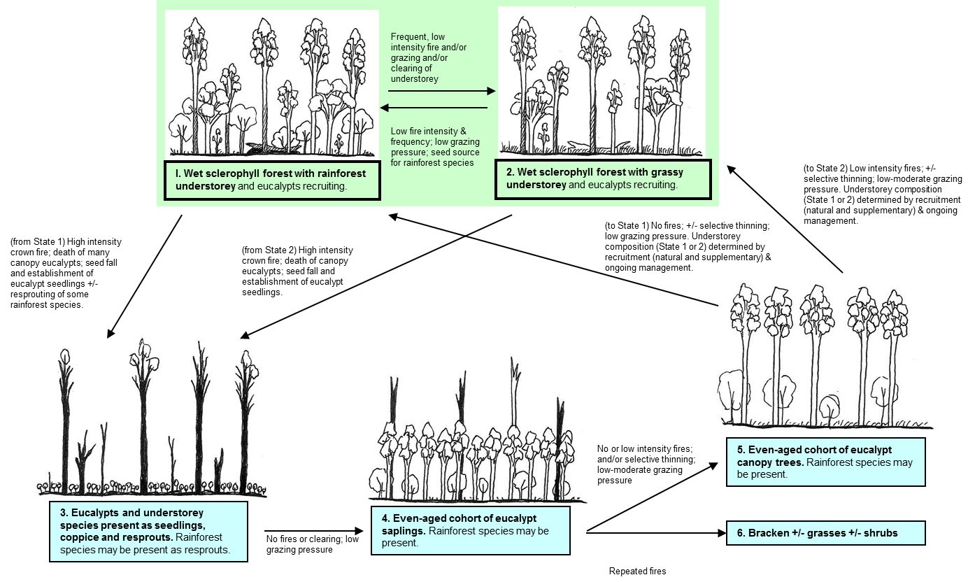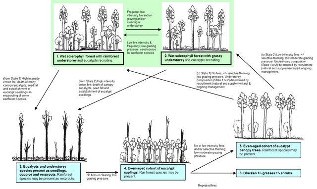 • Frequent, low intensity fire, or regular removal of woody understorey plants by other means, will encourage the shift of state 1 to state 2, and then to state 5 (wet sclerophyll forest with grassy understorey and no eucalypts recruiting).