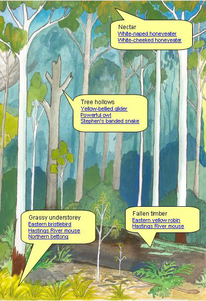 Even low severity fires can remove habitat such as large hollow-bearing trees that provide essential resources for many animals Wet sclerophyll forest becomes unsuitable for 3 threatened species (the eastern bristlebird Dasyornis brachypterus, northern bettong Bettongia tropica, and Hastings River mouse Pseudomys oralis) when grasses are replaced by rainforest shrubs. Certain fire regimes are recommended to maintain a grassy understorey in the known or potential habitat of these species | Many different types of plants and animals |