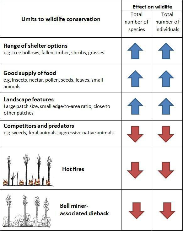 Different types of shelter for wildlife, a good (and varied) supply of food, the removal or control of weeds and feral animals, and the size and shape of habitat patches and their distance from each other, will help conserve wildlife in wet scherophyll forest.