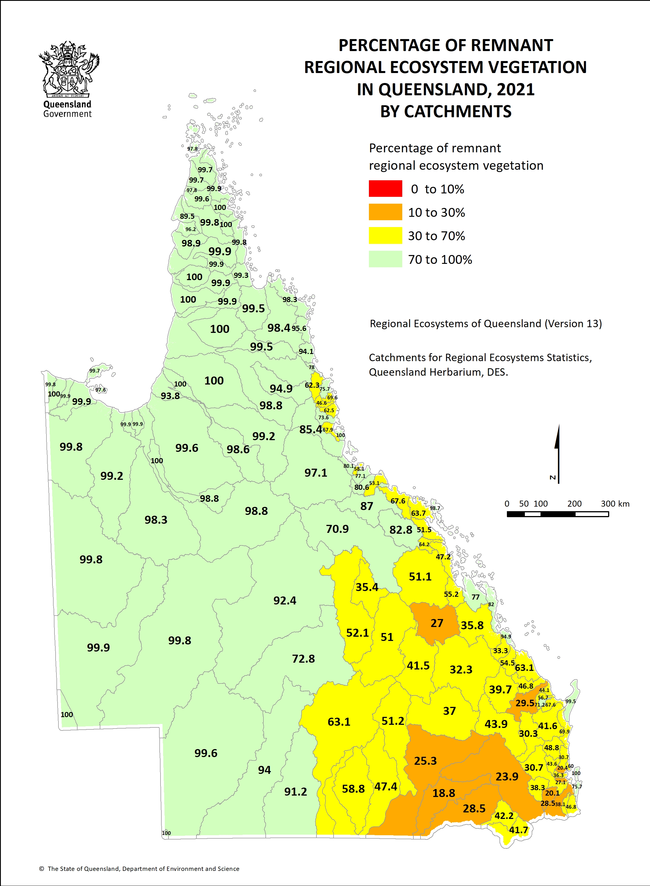 Catchment analysis of remnant vegetation by regional ecosystem vegetation communities between 1997 and 2021 showing analysis of regional ecosystems by catchment.