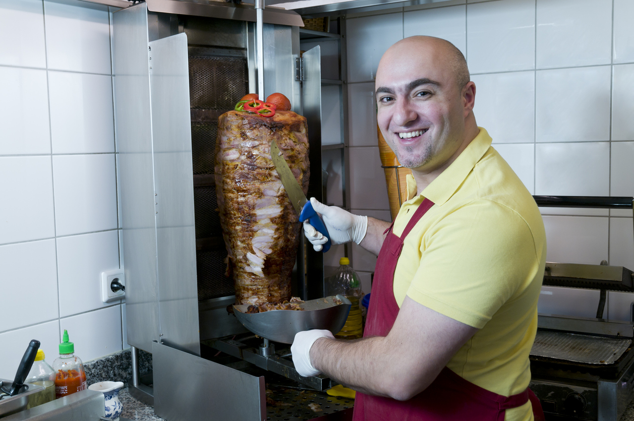 To avoid food poisoning, the internal temperature of the meat needs to reach at least 75°C before being cut from the spit. Even when the surface temperature reaches above 75°C, the internal temperature of the meat could potentially be in the danger zone of 5°C to 60°C. This will provide an ideal temperature for food poisoning bacteria to multiply and there is also a risk of cross-contamination from raw to cooked meat during slicing.