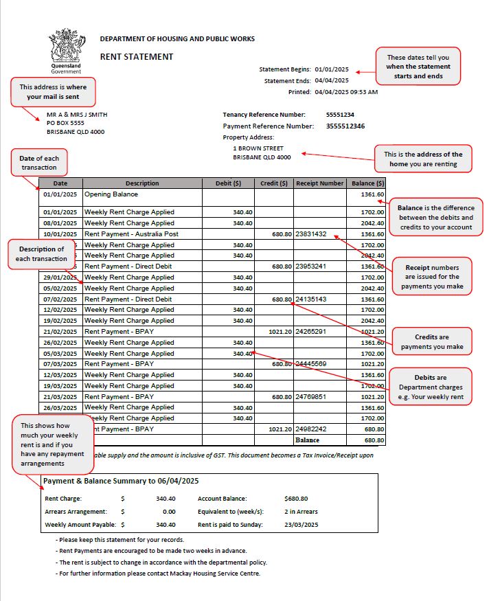 If you are a Queensland public housing tenant, the rent statement for the public housing property you live in shows the balance of your account (similar to a bank statement). It lists all charges by the department and payments made by you.