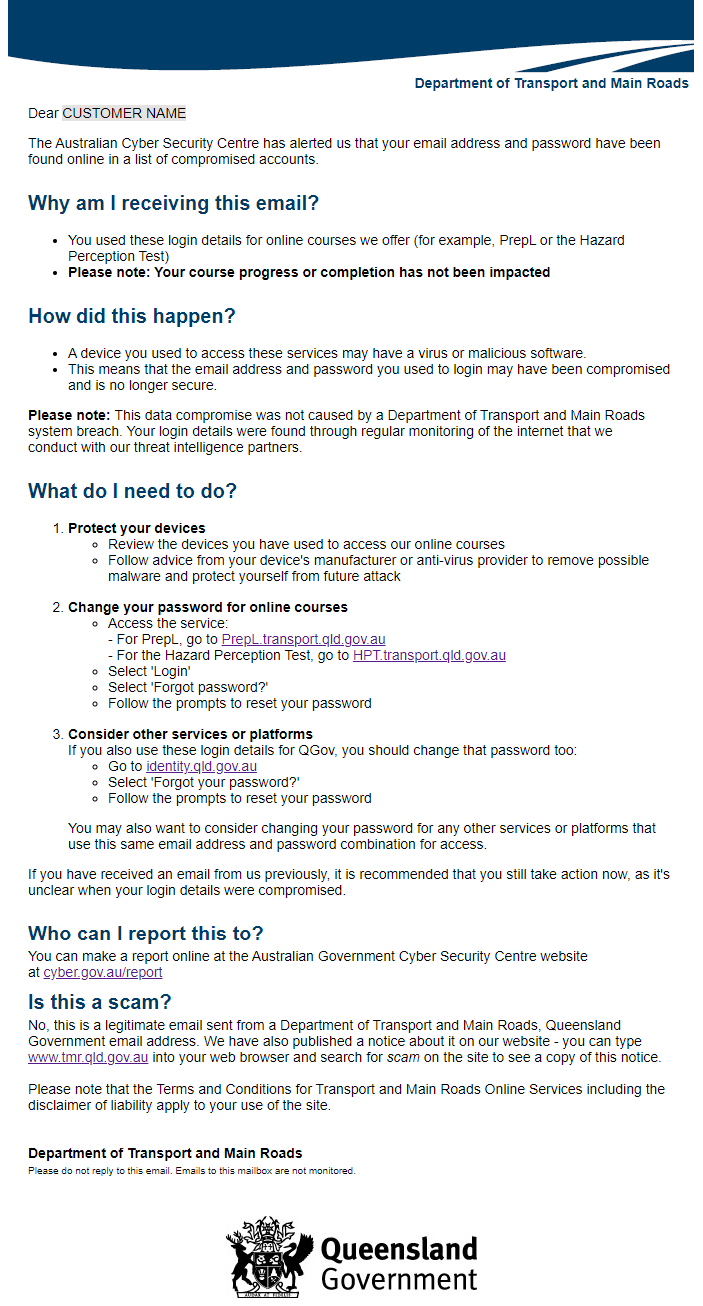 Please note: This data compromise was not caused by a Department of Transport and Main Roads system breach. Your login details were found through regular monitoring of the internet that we conduct with our threat intelligence partners.