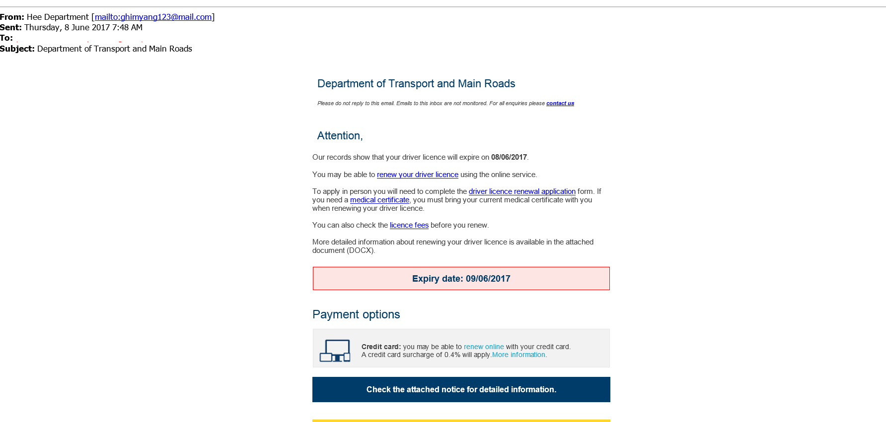 This email has several indicators that it has not been sent by the Department of Transport and Main Roads: