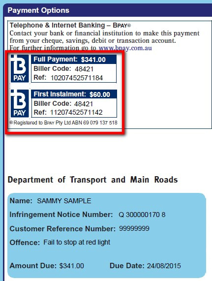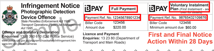 You can find your BPAY reference number for the full payment or for a voluntary first instalment midway down the left hand side of the infringement.
