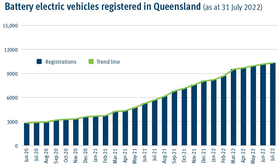 This graph shows the number of battery electric vehicles registered in Queensland from June 2020 to July 2022.