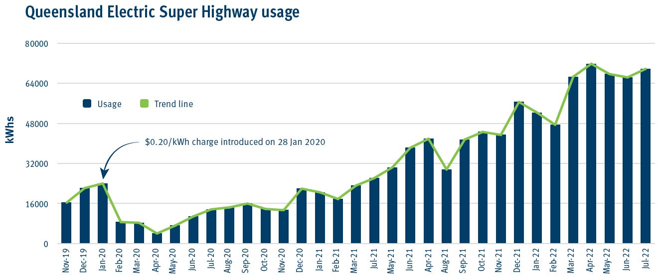 This graph shows the number of kilowatt-hours used along the Queensland Electric Super Highway from November 2019 to July 2022.
